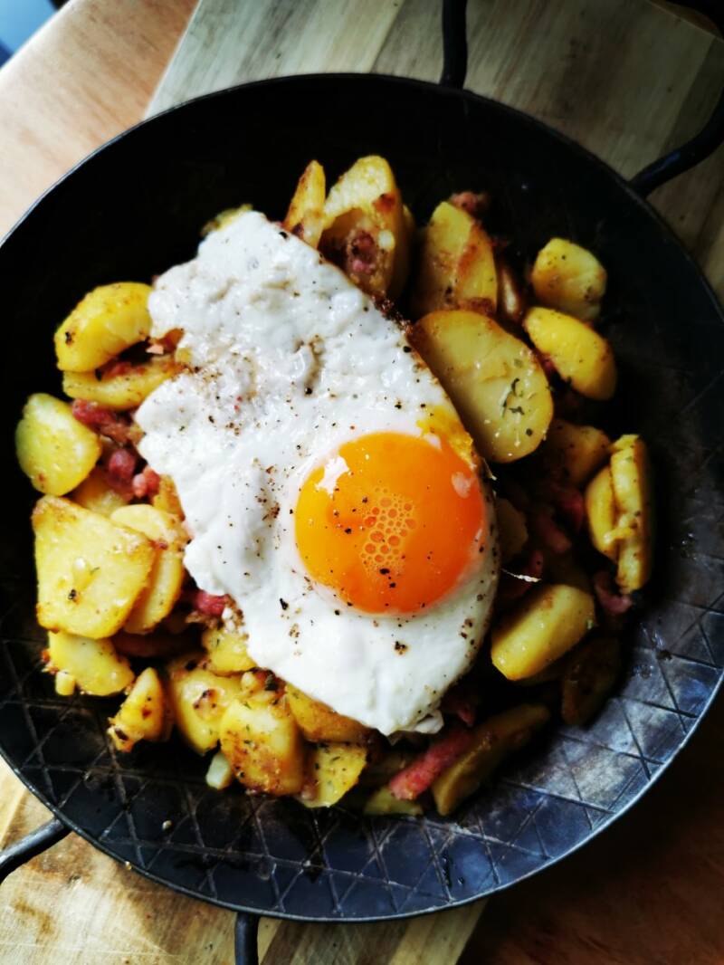 Stap 9: Schep de aardappelen op je bord en serveer het spiegeleitje erboven op, verdeel de overgebleven peterselie erover en aanvallen maar!