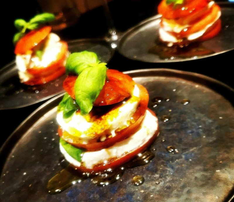 Stap 4: Stapelen maar! Begin met een plakje tomaat, maal een klein beetje peper en zout hierover, plakje mozzarella erop, paar druppels van je olijfolie mengsel, 2 blaadjes basilicum en dit alles nog een keer in exact dezelfde volgorde. Sluit af met een deksel van je tomaat.